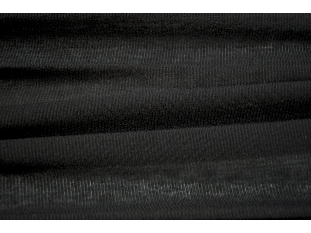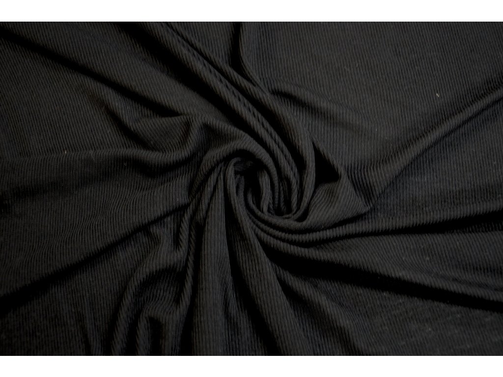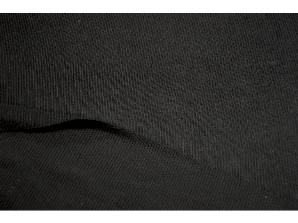 Bavlněný úplet v černé barvě s žebrováním. Elastický více do šířky, do délky jen pruží. Na omak velmi příjemný a jemný.