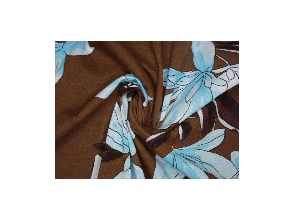 Bavlněný úplet jednolíc s potiskem velkých květů na hnědém podkladu. Elastický do šířky.