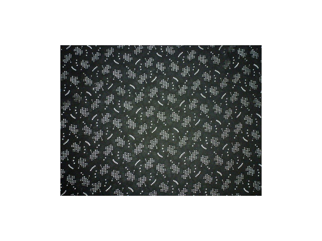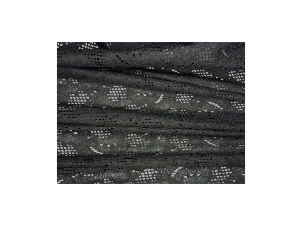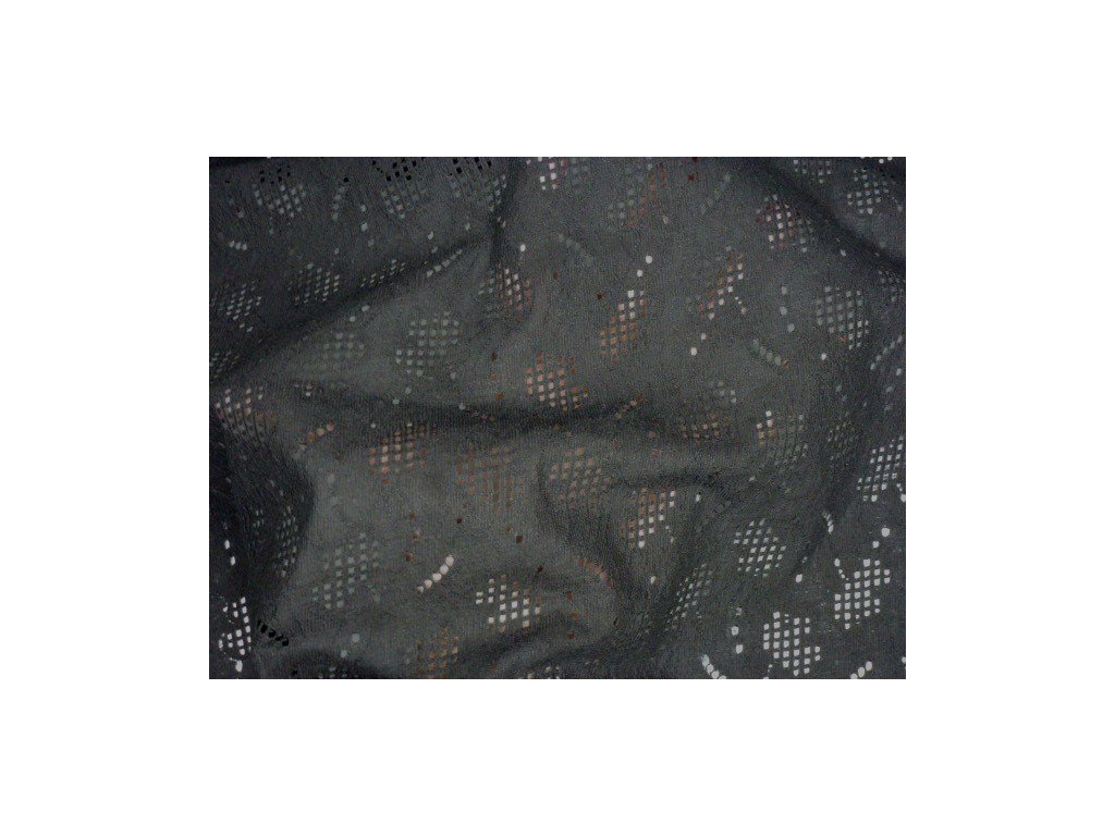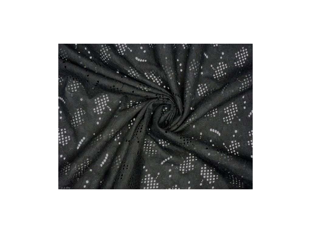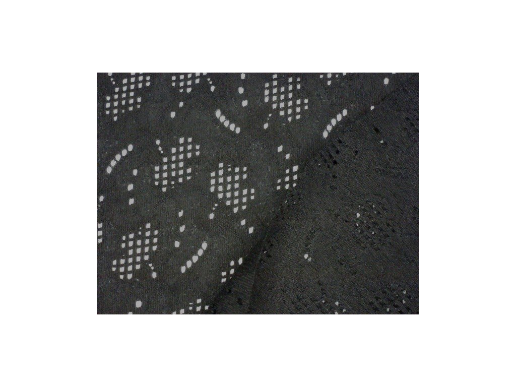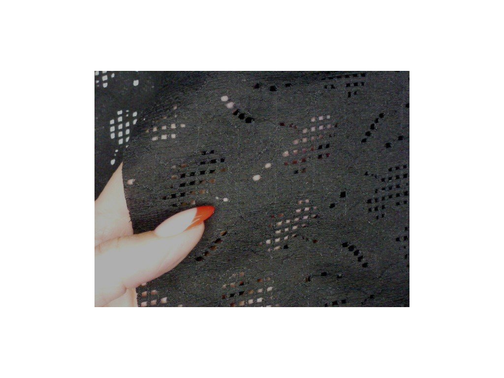 Elegantní krajka v černé barvě, která svým vzorem připomíná jemnou madeirovou výšivku. Vyrobená ze směsi polyesteru a polyamidu, nabízí nejen krásný vzhled, ale i příjemnou pružnost. Materiál je elastický po délce, proto je důležité s tím počítat při pokládání střihu.