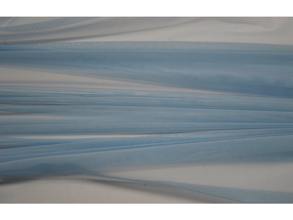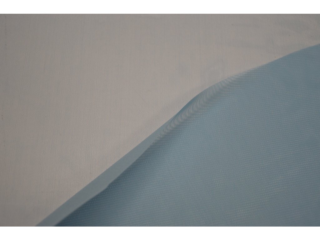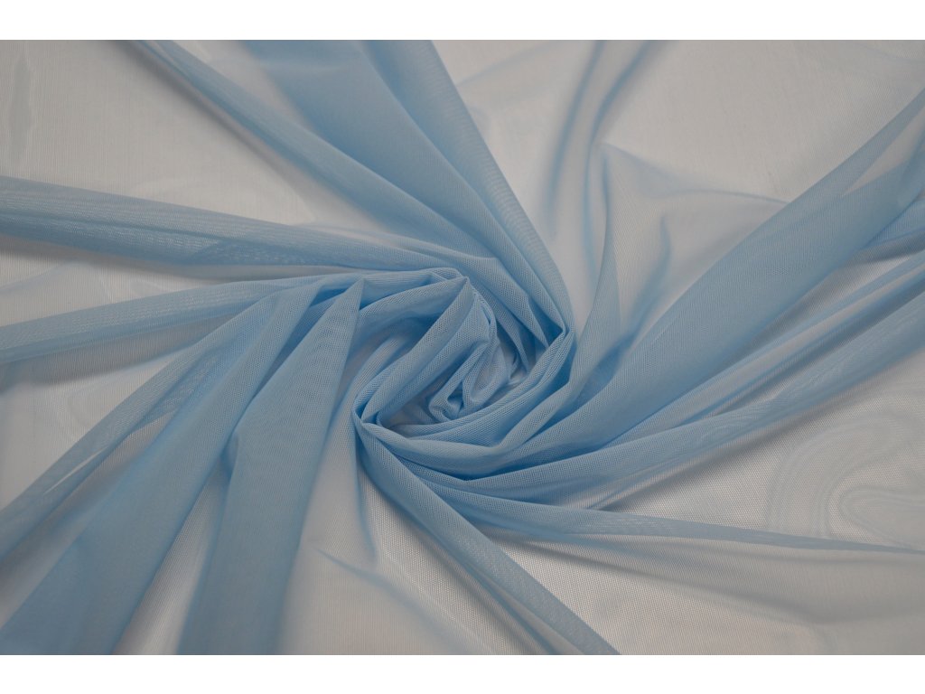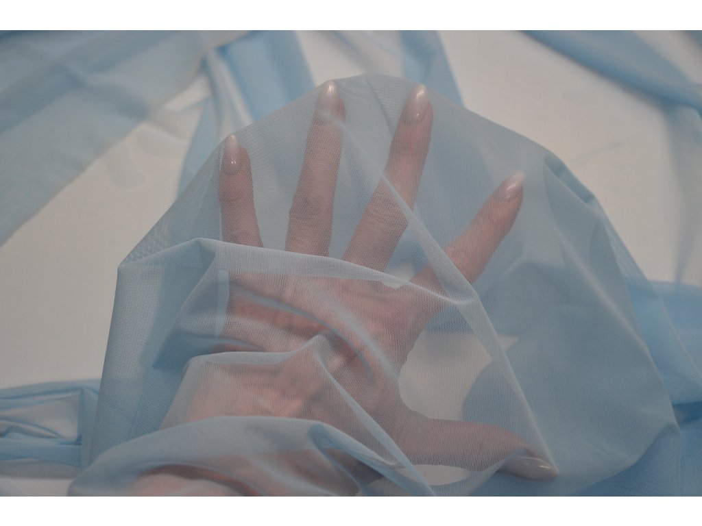Elastický bledě modrý tyl. Jde o splývavou elastickou variantu této látky. Elasický všemi směry.