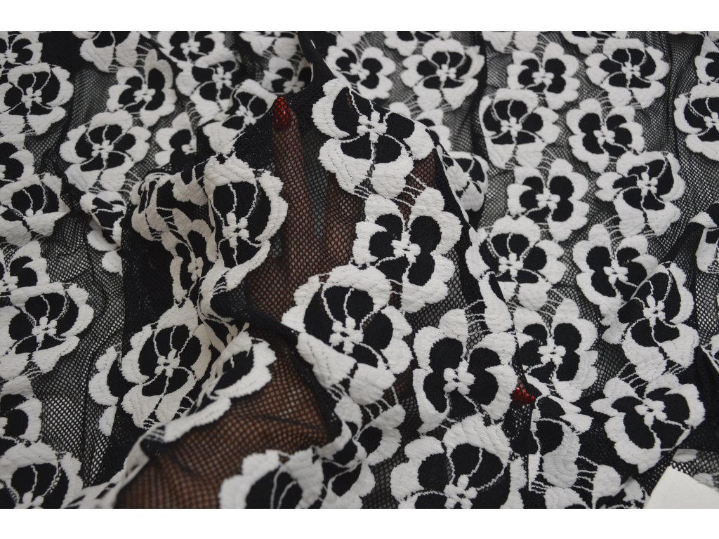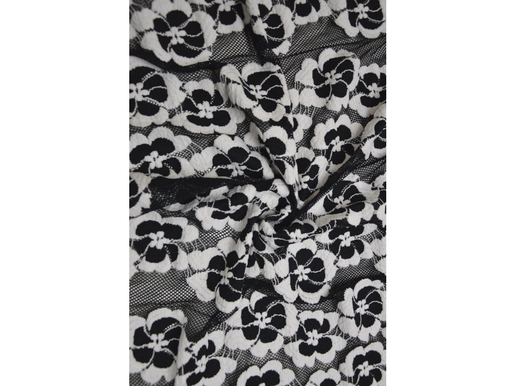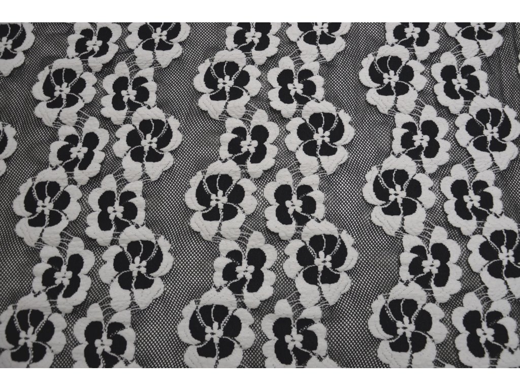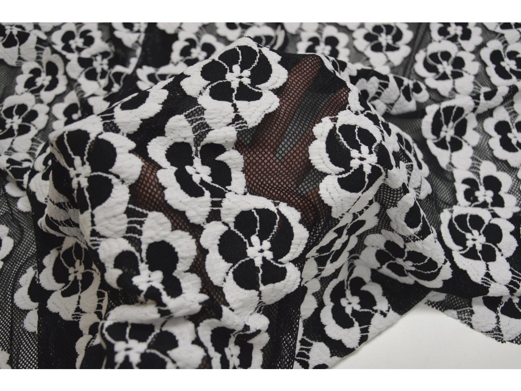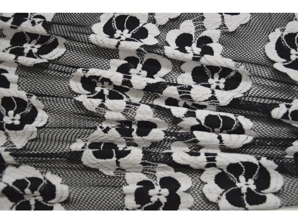 Elegantní krajka v černé barvě s bílými květy. Je elastická všemi směry, což zajišťuje pohodlné nošení i snadnější zpracování při šití.