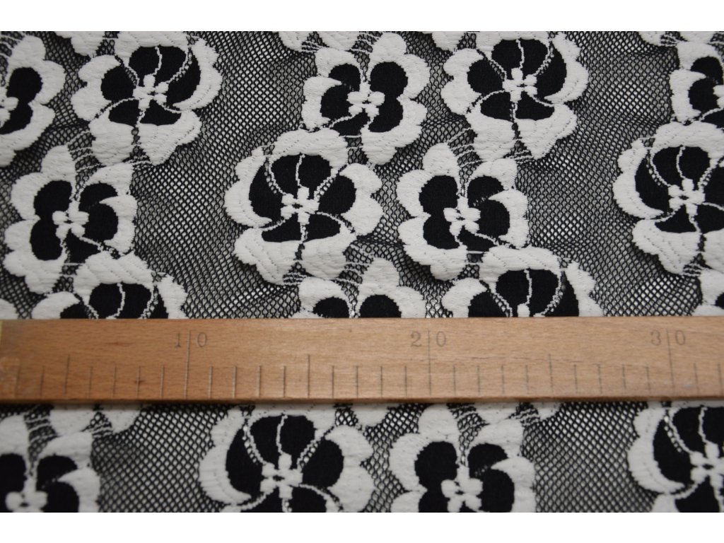 Černobílá elastická krajka. Pružná všemi směry.