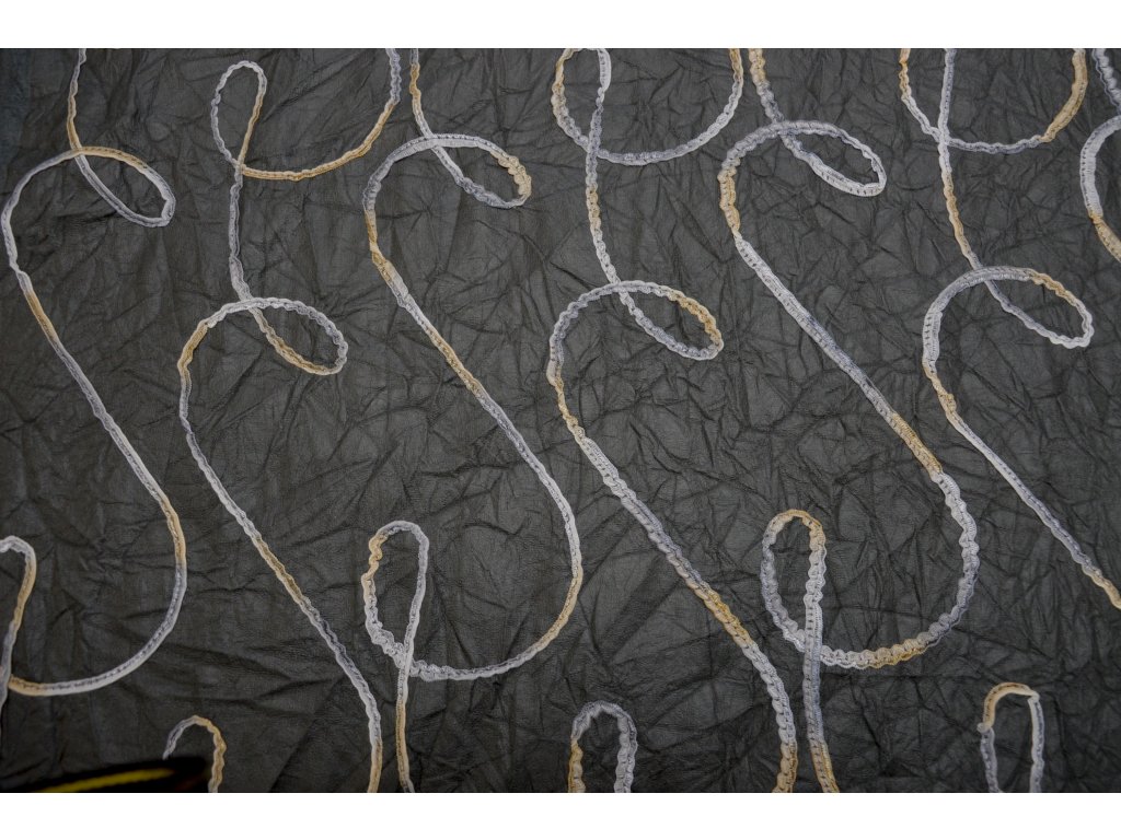 Středně šedý úplet s krajkovou aplikací. Krásná látka, šedý úplet s lícovou stranou s polyuretanovým potiskem a krakovou aplikací.