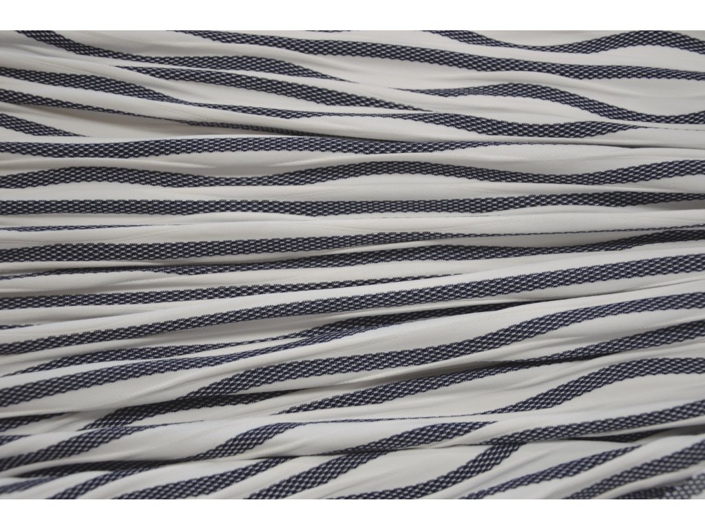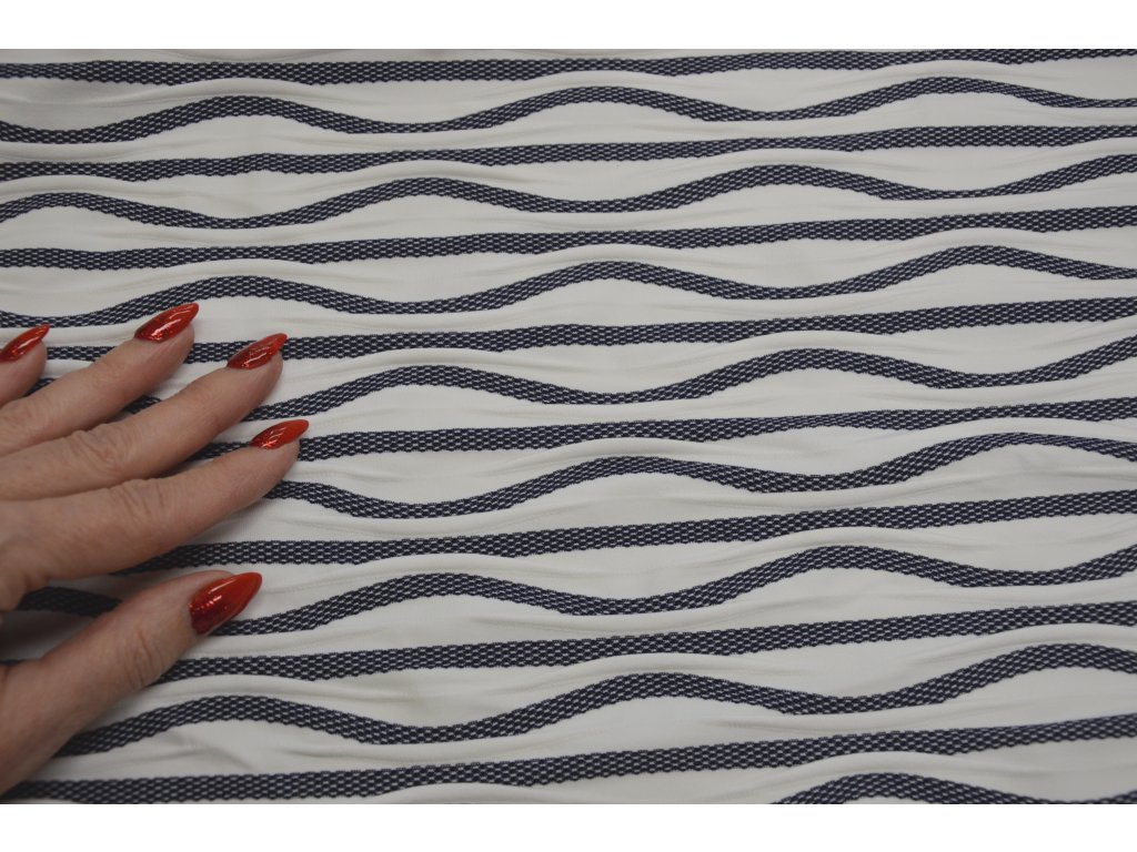 Elastický úplet v bílé a tmavě modré barvě s plastickými vlnkami. Je elastický všemi směry. Vlnky jsou vystouplé - plastické. Krásný a zajímavý materiál.