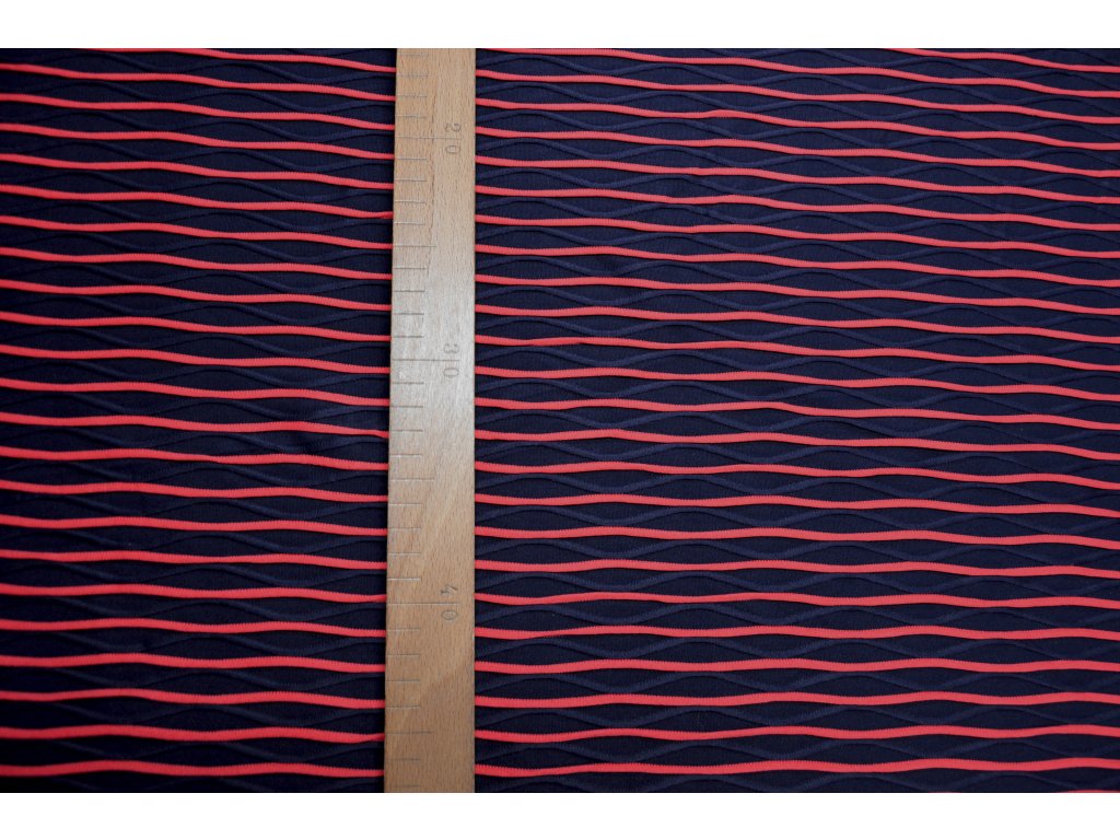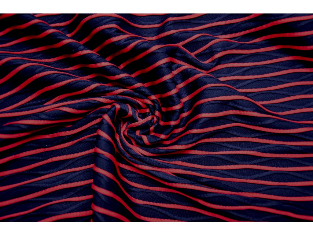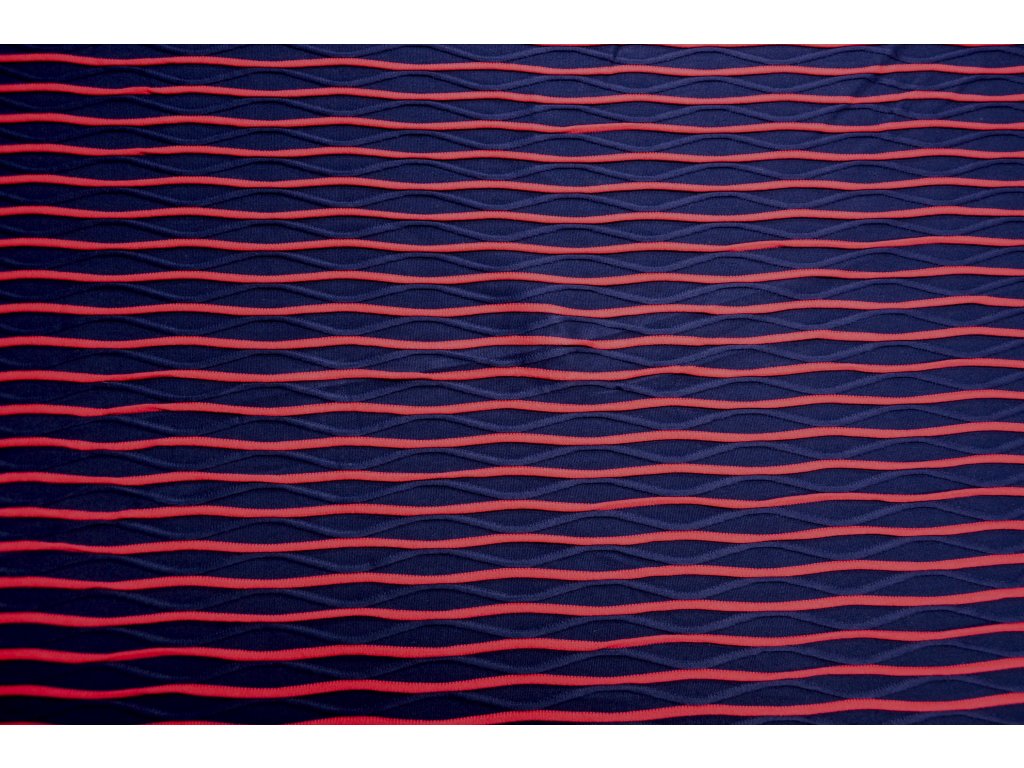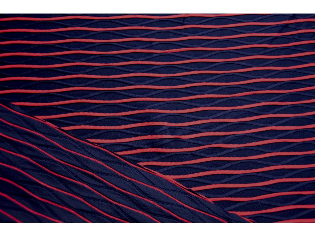 Pružný úplet v tmavěmodré a růžové barvě s plastickými vlnkami. Je elastický všemi směry. Vlnky jsou vystouplé - plastické. Krásný a zajímavý materiál.