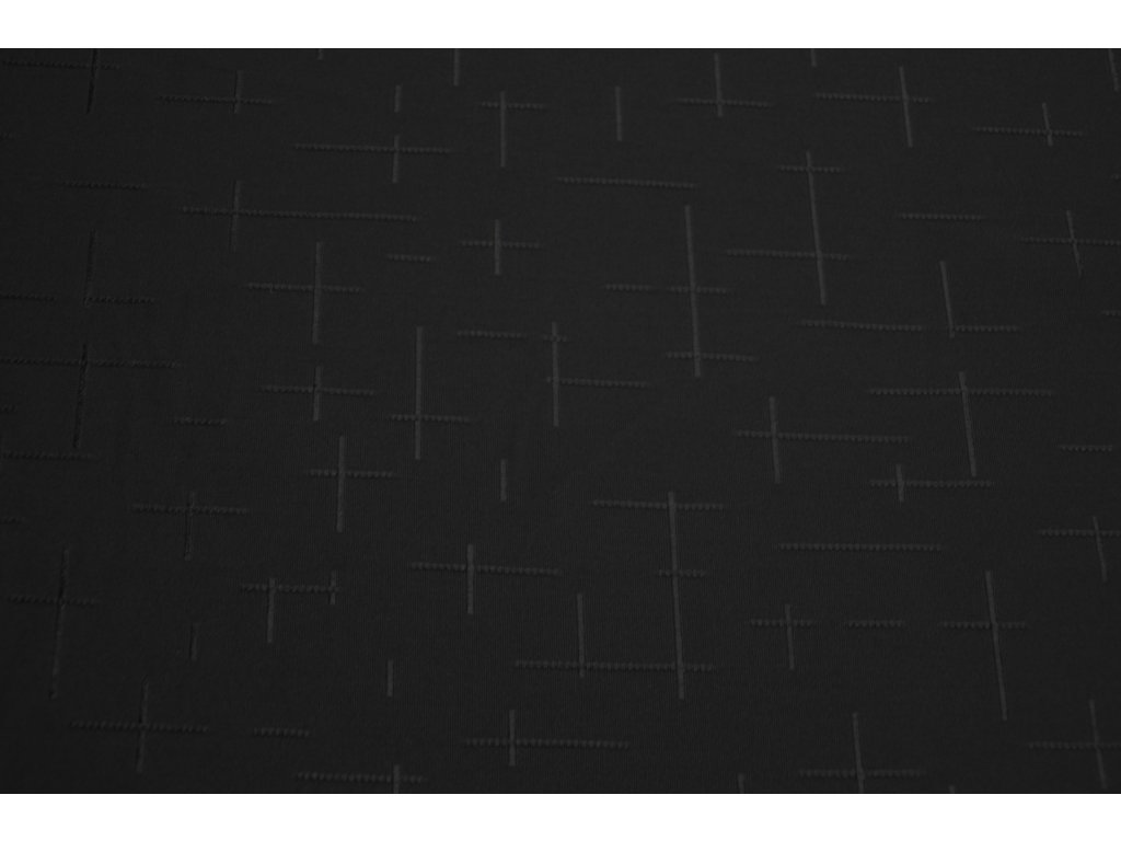 Kvalitní španělský elastický úplet v černé barvě se žakárovým vzorem.