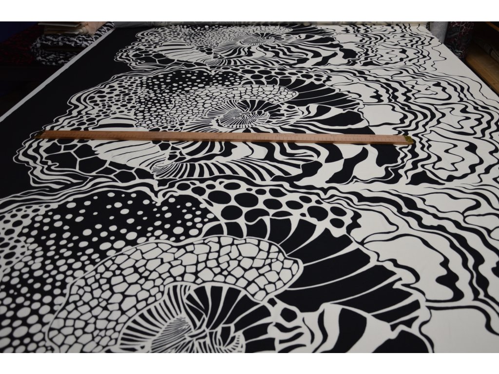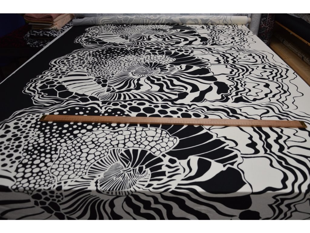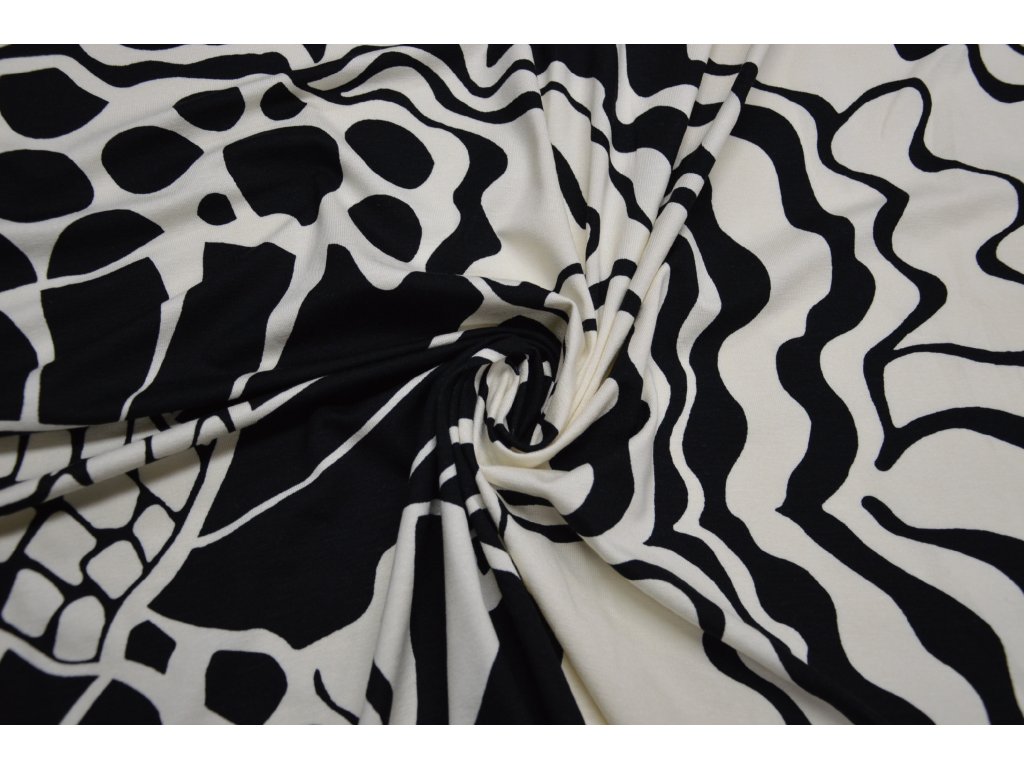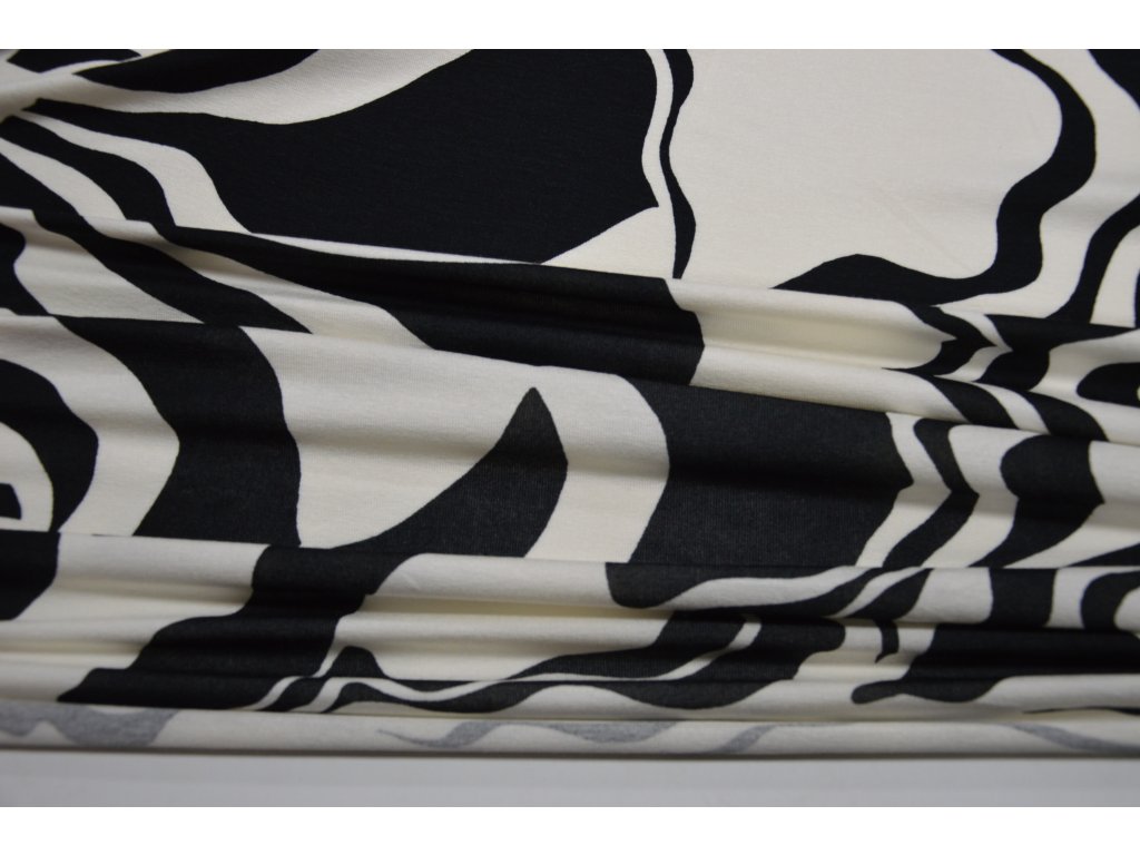 Viskózový úplet elastický se zajímavým vzorem velké květiny. Elastický všemi směry. Černobílá kombinace. Šířka květiny je 75 cm. Bude senzační při použití na výrobu dlouhých šatů. Motiv je natišten na šířku látky to znamená, že střih se nebude pokládat podélně. Bílá je tzv. lomená padá lehce do smetanova.