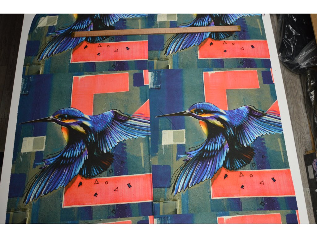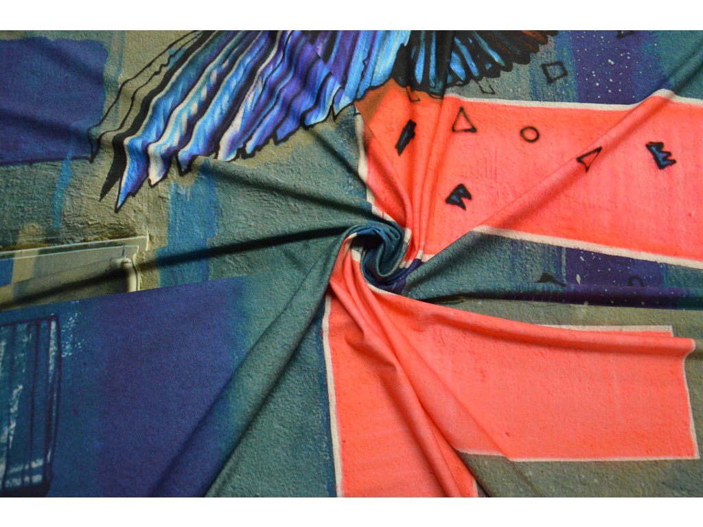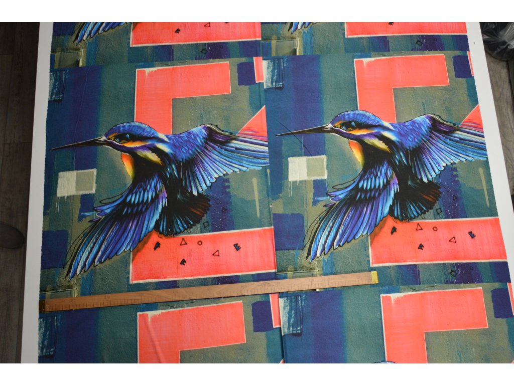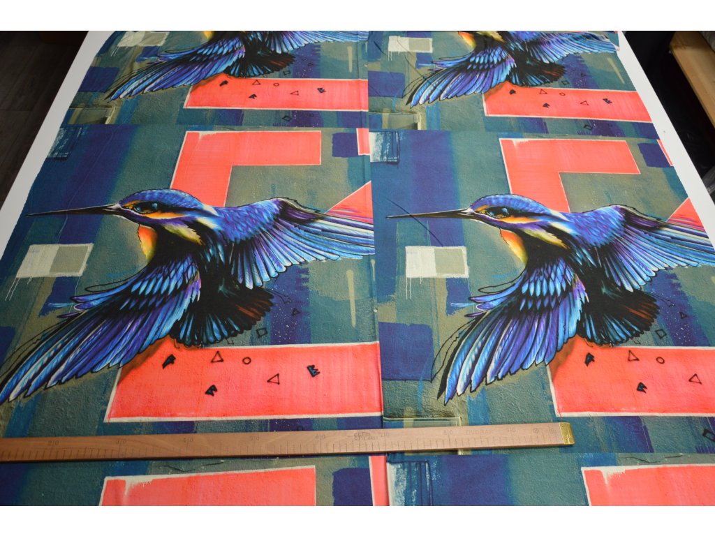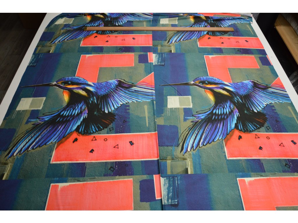 Kvalitní viskózový úplet s motivem ledňáčka. Panel obsahuje 2 motivy vedle sebe. Šířka panelu 140 cm a výška panelu je 70 cm.