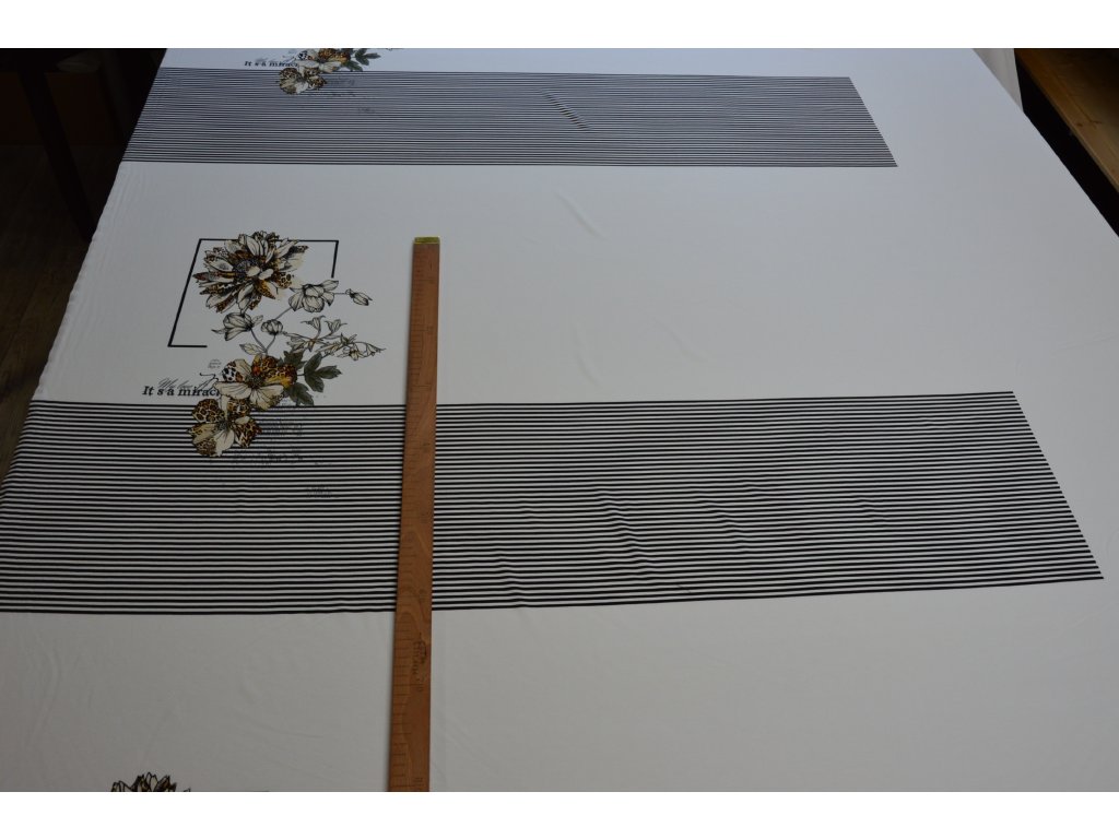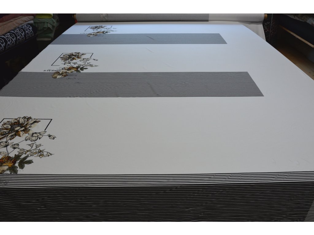 Pokud budete kupovat 2 a více panelů, látka Vám přijde nerozstříhaná na jednotlivé panely. Panel začíná na spodním okraji proužků běží přes květinu k spodnímu proužku dalšího motivu.