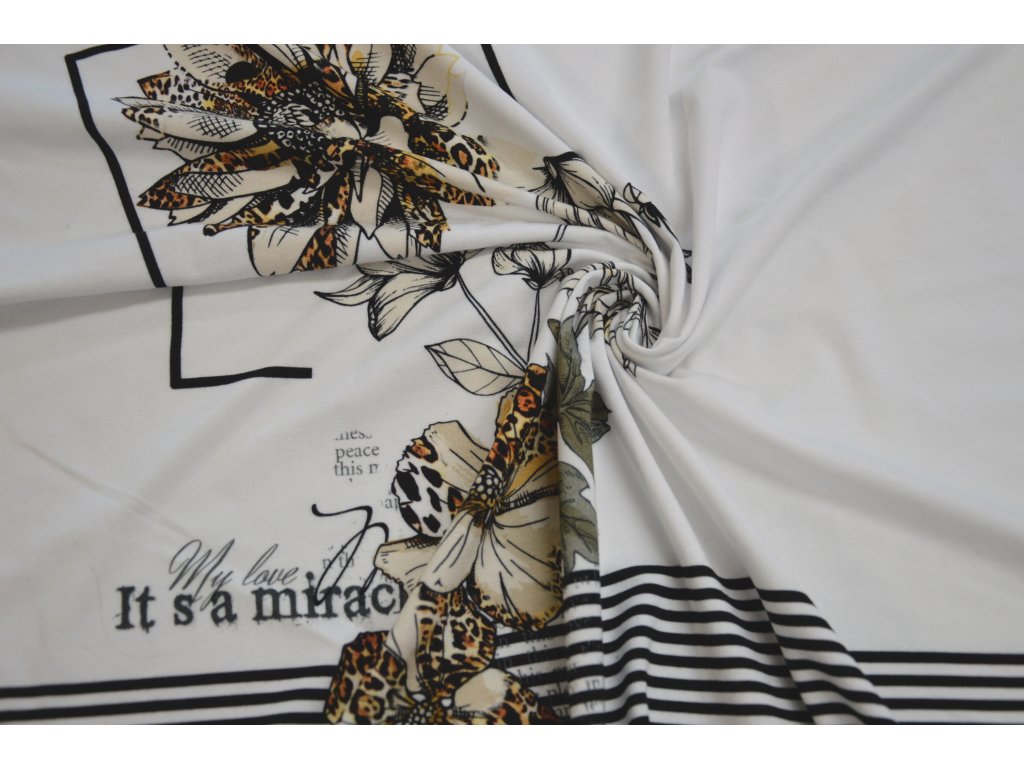 Kvalitní viskózový úplet s motivem pruhů a květiny s panter vzorem. Šířka panelu 170 cm a výška panelu je 80 cm.