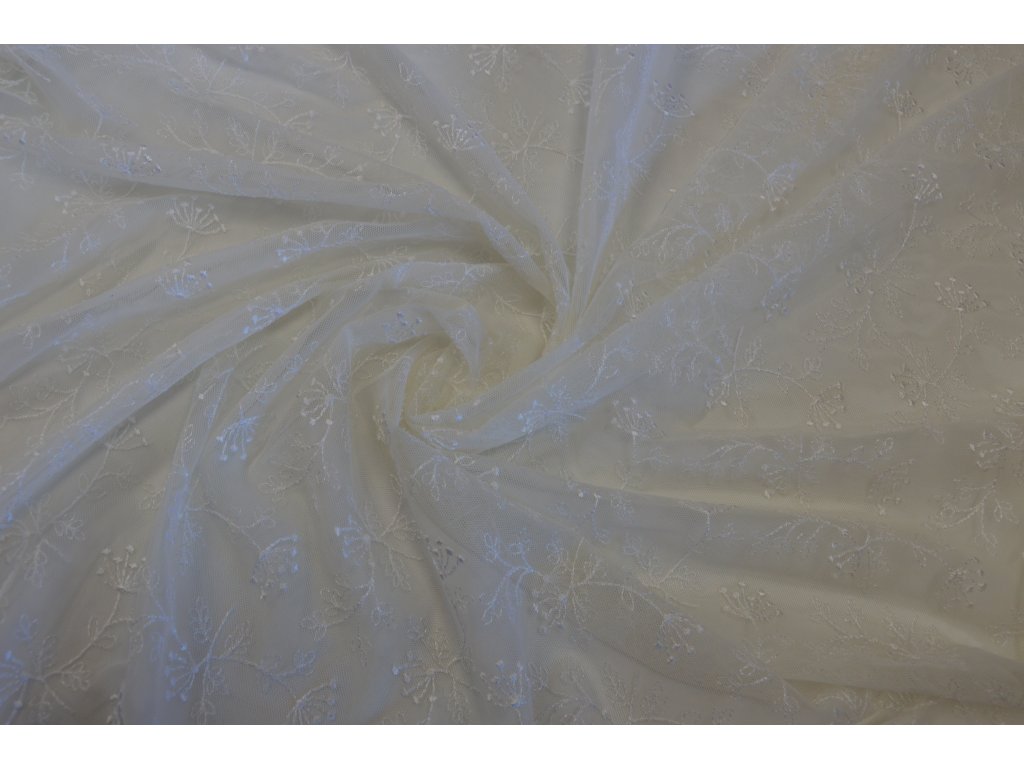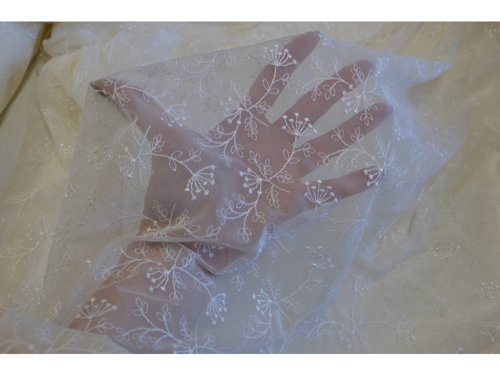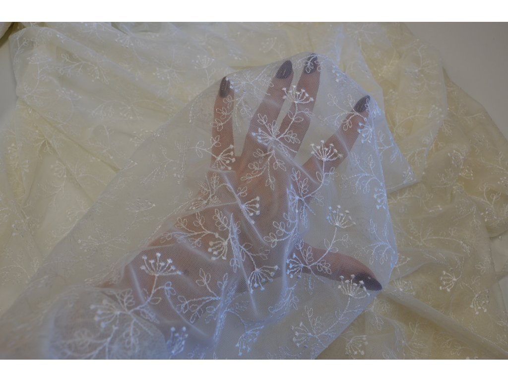 Luxusní francouzský vyšívaný tyl v elegantní světlé šampaň barvě působí jemně a sofistikovaně. Je lehce elastický díky kombinaci materiálů, avšak výšivka mu dodává pevnost a stabilitu. Skvěle se hodí na společenské šaty, svatební modely, korzety, sukně či zdobení oděvů.